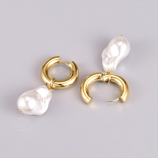 SISSLIA Hot Selling Removable Chunky Hoop Earrings With Irregular Baroque Pearl Charm Stainless Steel Gold Plated Hoop Earrings