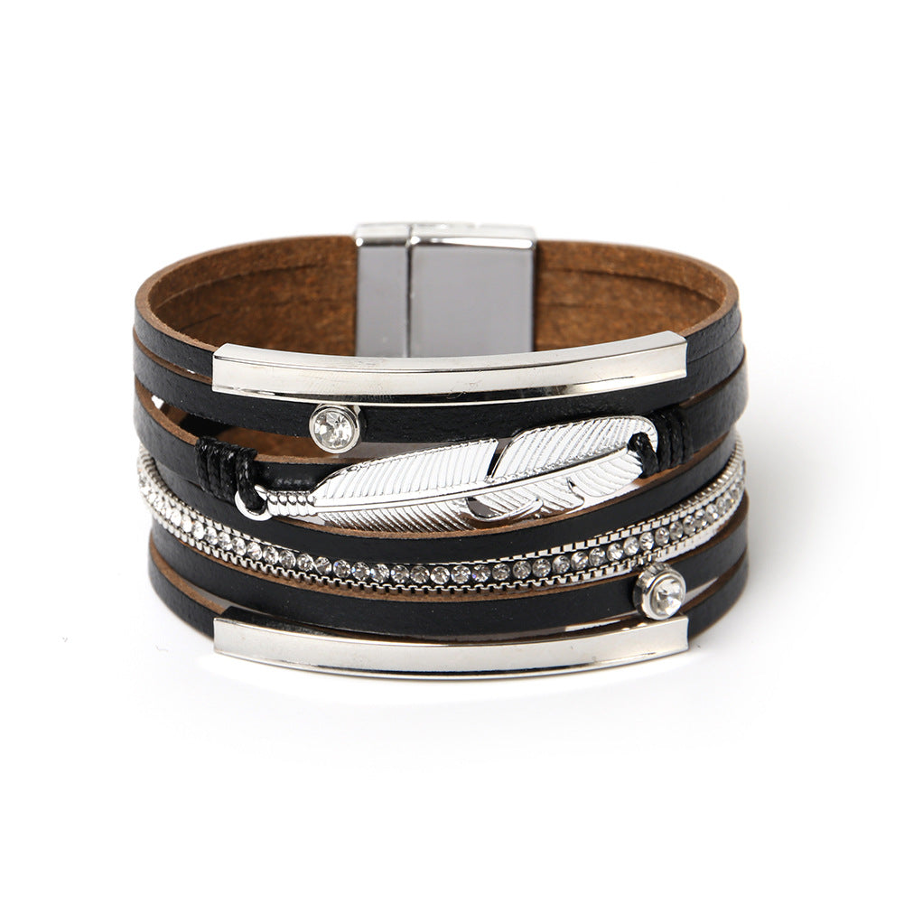Sisslia Bohemian Multilayer Buckle Leather Bracelet Handmade Woven Magnetic Crystal Wide Band Feather Leather Bracelet